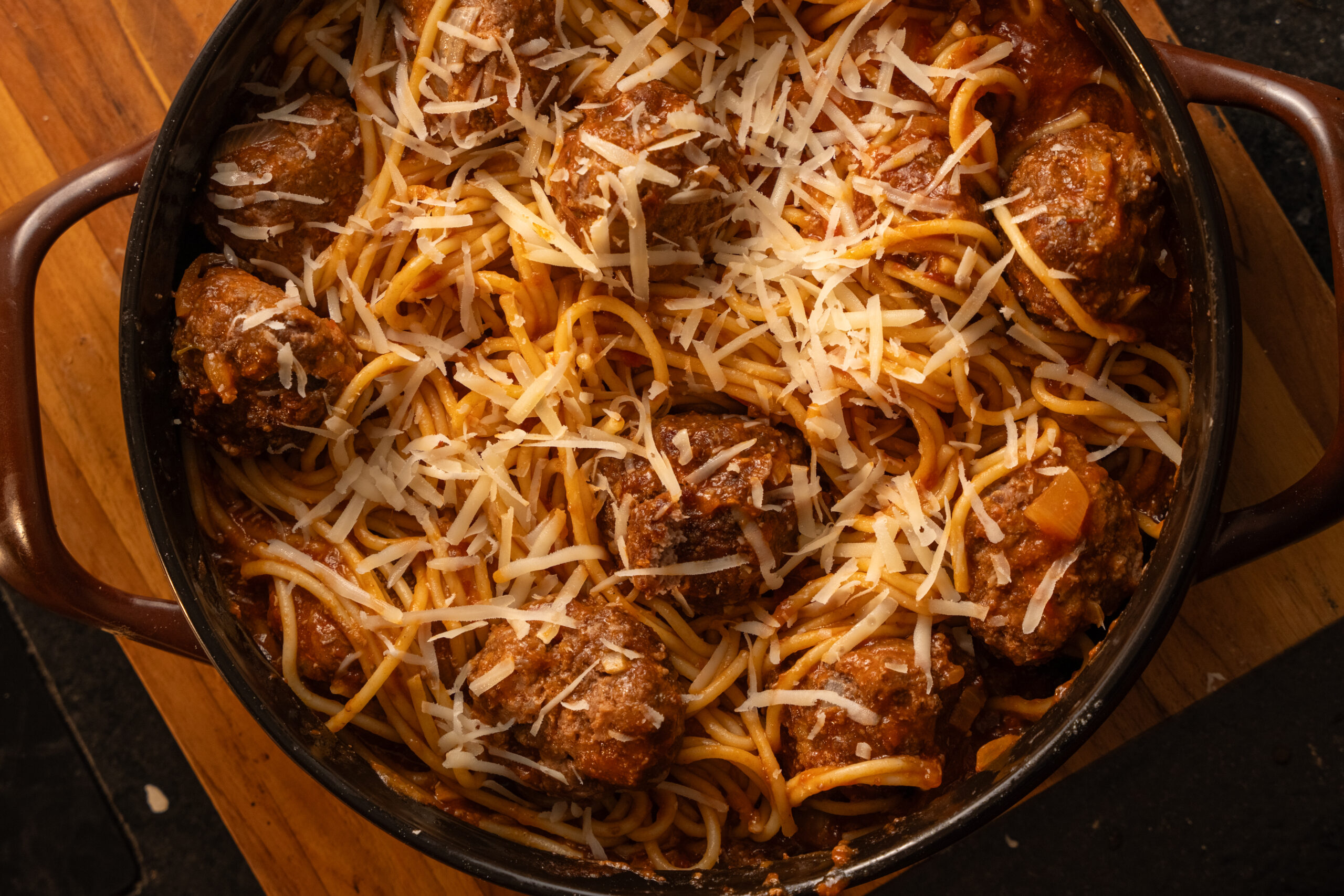 Pronto! 🍅🧀 Massa soltinha, molho encorpado e almôndegas suculentas.